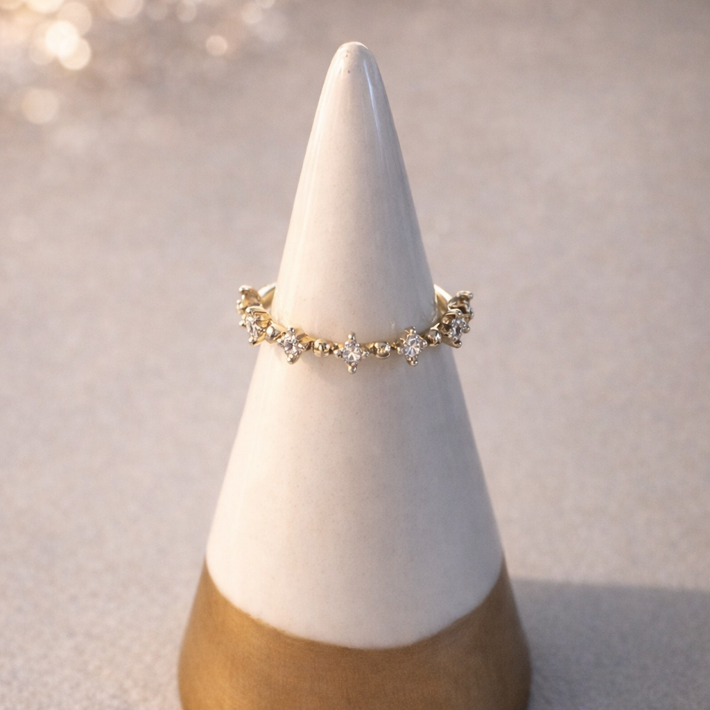 The Aurelia Band is a timeless expression of understated luxury, designed to elevate both everyday wear and intentional layering. Crafted in luminous 14K yellow gold, this delicate band is adorned with a row of finely set diamonds that catch the light with effortless brilliance.