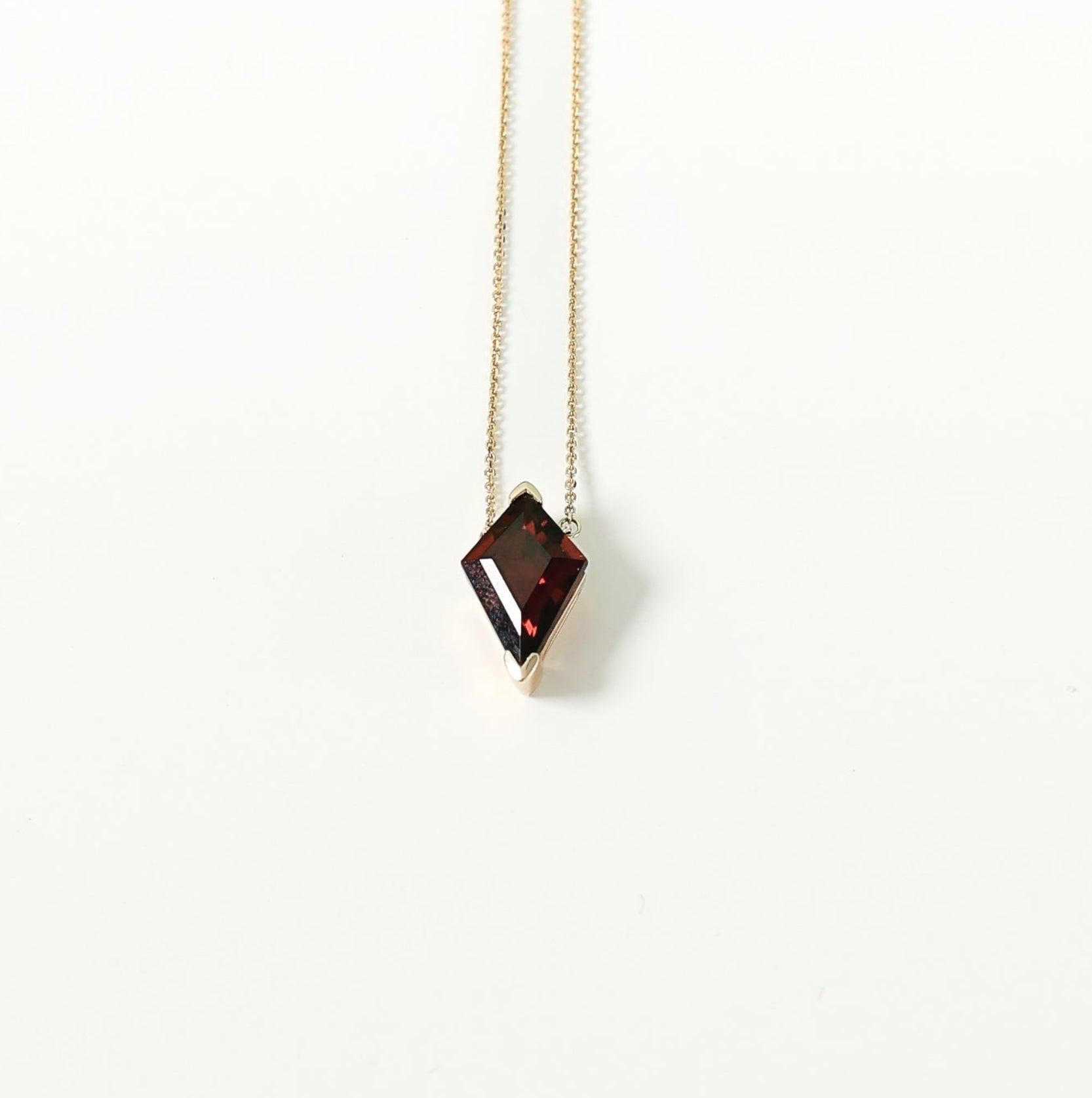 The Emberline Necklace captures the quiet intensity of inner fire. Featuring a kite-shaped garnet set in luminous 14K yellow gold, this piece is designed to balance strength and refinement. The garnet’s deep, smoldering red hue reflects resilience, passion, and grounded confidence—an elegant nod to power worn with intention.